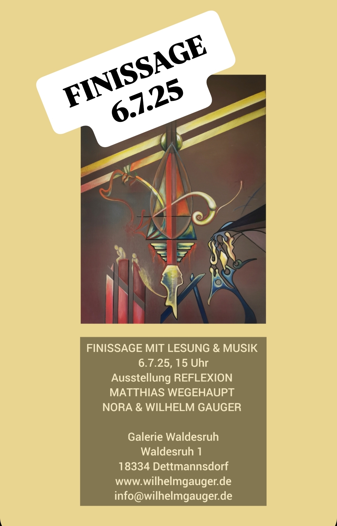 Dieses Jahr zeigten wir die Ausstellung "REFLEXION" mit Matthias Wegehaupt, Nora & Wilhelm Gauger in der Galerie Waldesruh. Einen wunderbaren Abschluss der Ausstellung bildete die Lesung des Malers und Schriftstellers Matthias Wegehaupt. Aktuell zeigen wir gesammelte Werke und künstlerische Arbeiten der Familie Gauger.